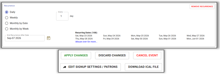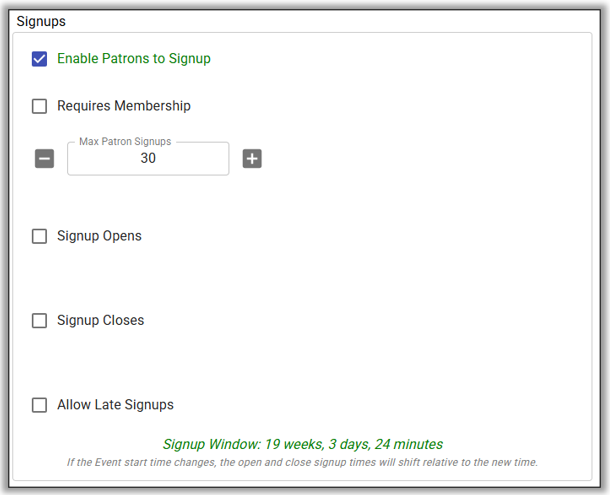 - Signup Opens: Unchecked because patrons can signup anytime.