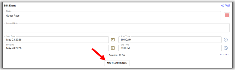 - Recurrence: Daily - In this scenario, guest passes will be available for purchasing daily.