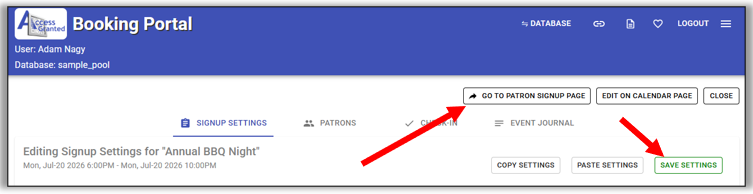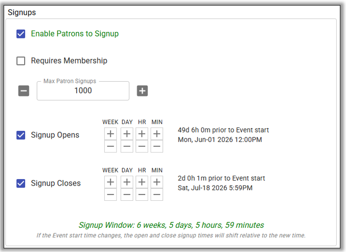 - Enable Patrons to Signup: Checked. This turns on the event.