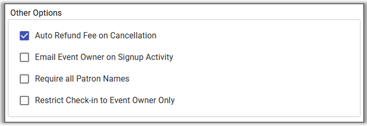 - Auto Refund Fee on Cancellation: Unchecked in this scenario. If a patron cancels, the refund will be automatically issued.