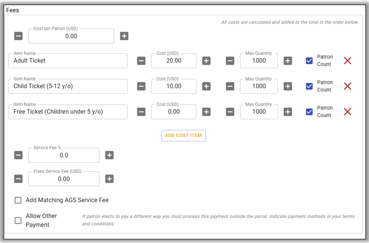 - Cost per Patron: $0.00 (NA) - Since we are charging different prices per age, we are going to use the next feature instead.