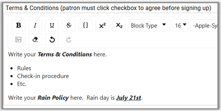 - Terms & Conditions: In this case, add your rain policy and makeup date.
