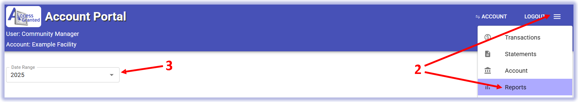 2) In the Account Portal, click the Menu, then Reports