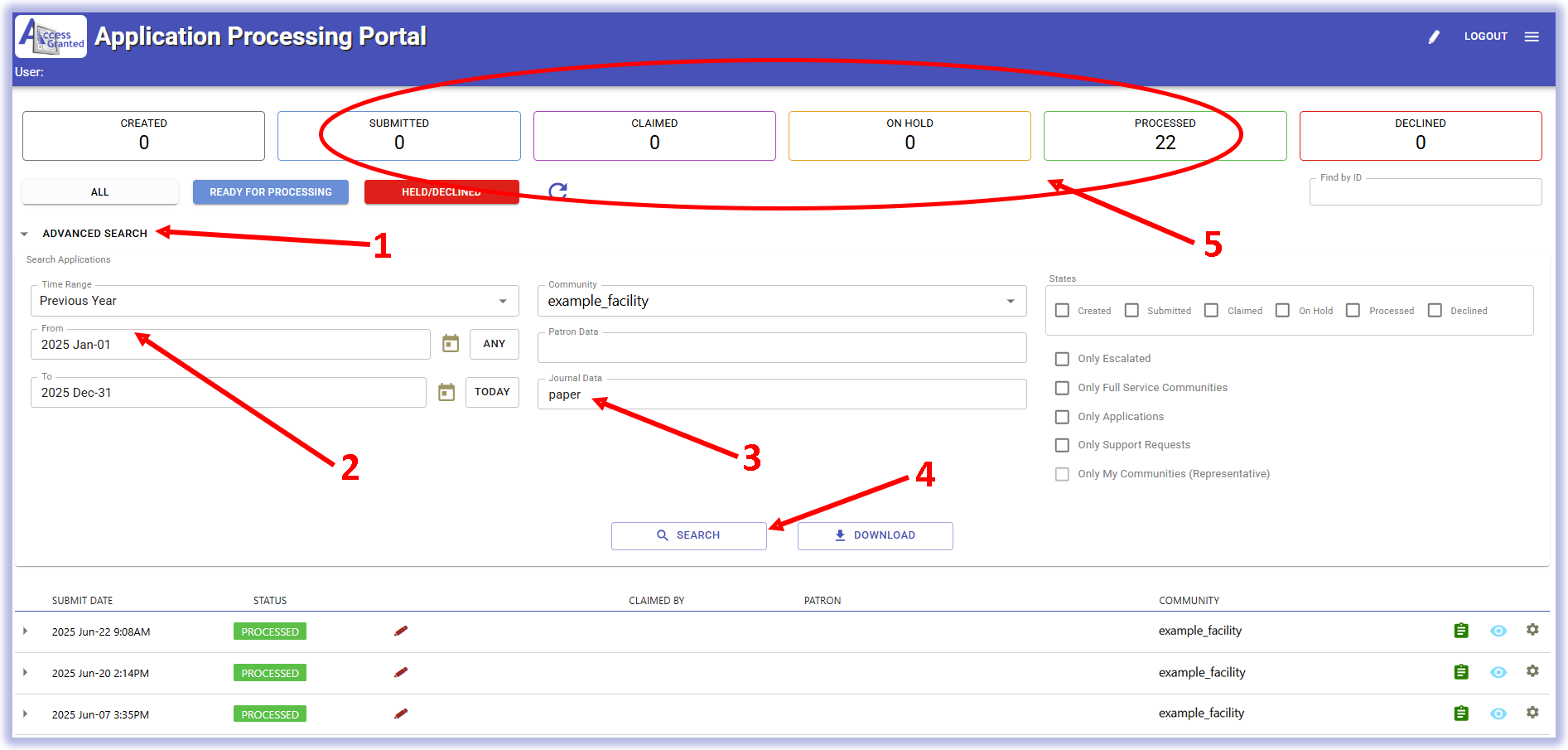 1) In the Application Portal, click the arrow icon next to ADVANCED SEARCH, to open the search menu