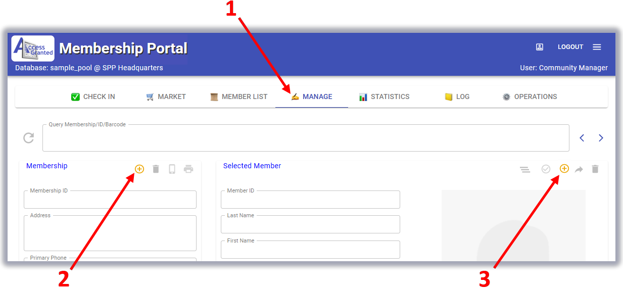 Individuals and families are managed in the Manage tab. The Manage screen is split into two. The left side is the Membership section, where the household’s information is located. On the right side, the Member section has the individual patrons who live in the household.
