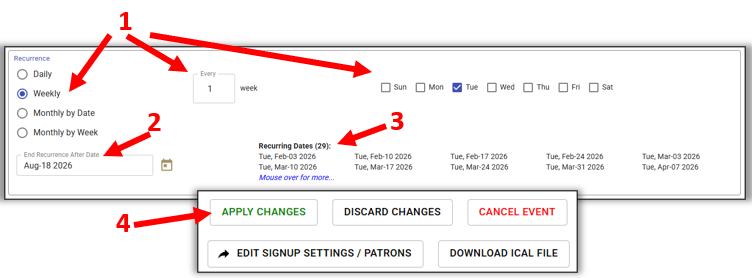 For example: You have weekly meetups every Tuesday & Thursday evening. You wish to change the meetup to every Wednesday & Saturday evening.