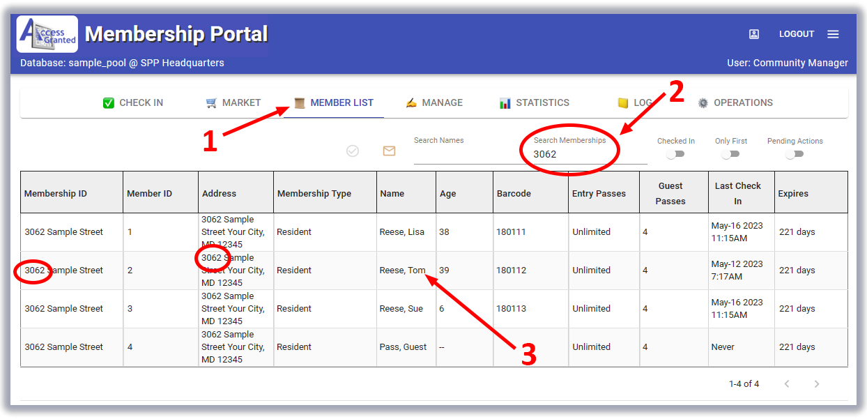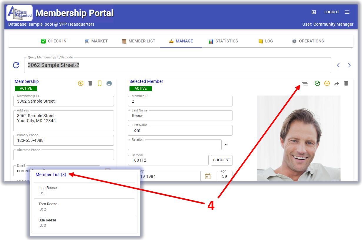 Individuals and families are managed in the Manage tab. The Manage screen is split into two. The left side is the Membership section, where the household’s information is located. On the right side, the Member section has the individual patrons who live in the household.