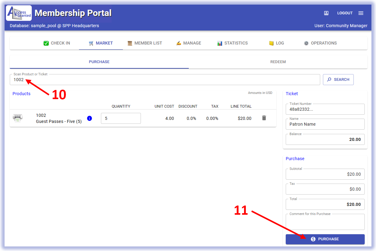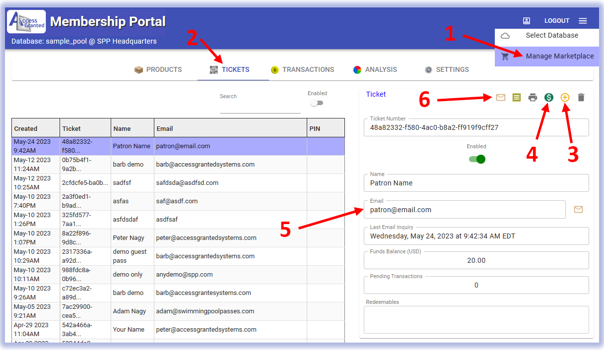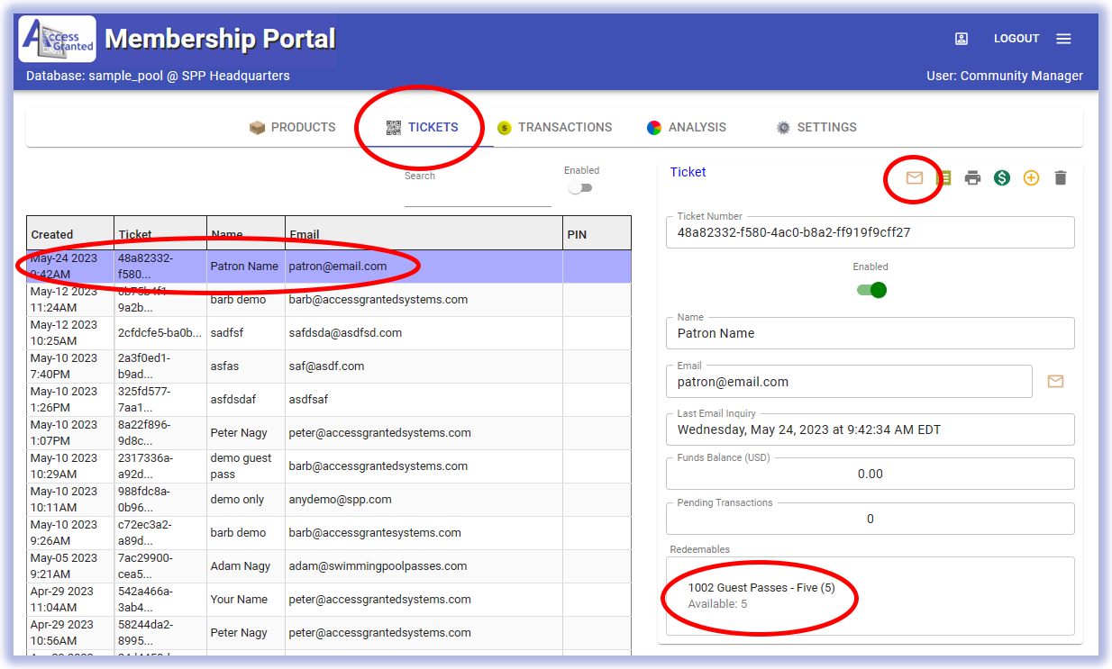 The redeemable product has now been added to the ticket. You may go back to the Manage Marketplace and view the ticket. You will see the product on the ticket. Click the Envelope Icon to email the ticket to the patron