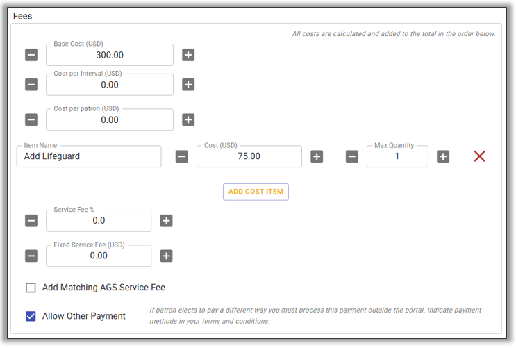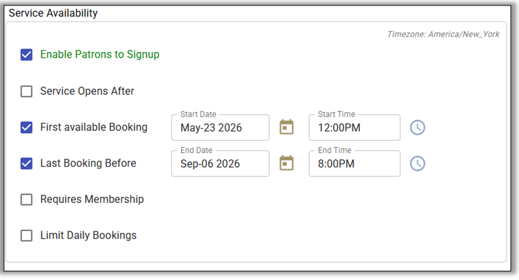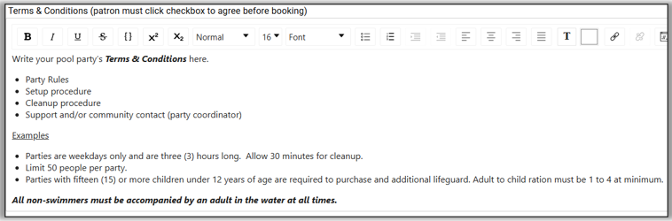 - Availability: We did not need to add any special dates/time for parties. If the Swim Club had bonus days in September when a party could happen, we could add availability.
