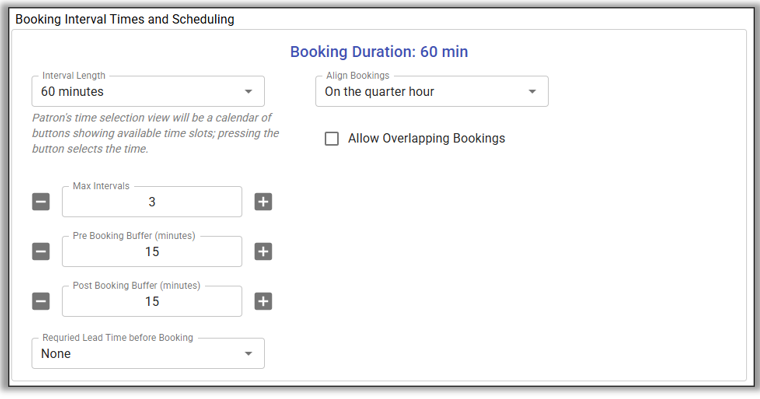 - Align Bookings: On the quarter. This will allow for maximum reservations per day. Reservations will not need to start at the top of the hour.