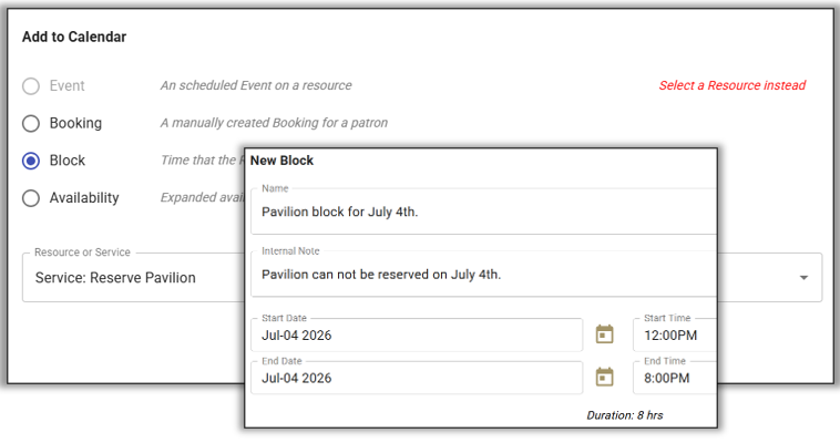 - Since there are no reservations July 4th, the Block feature will block this date.