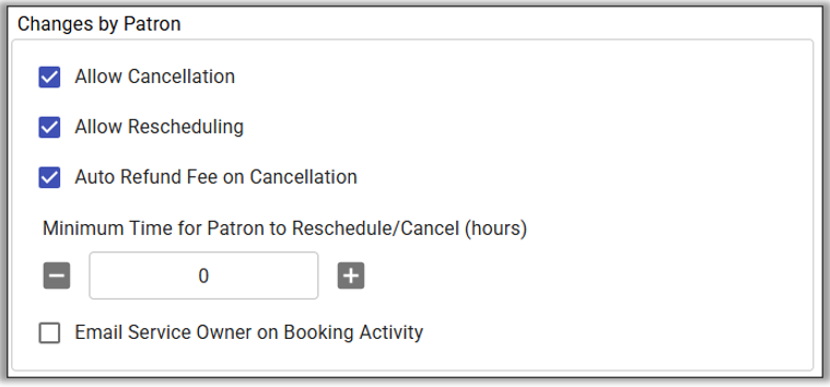- Minimum Time for Patron to Reschedule/Cancel: Zero in this scenario. But you can change this to prevent last minute cancelations (and refunds).