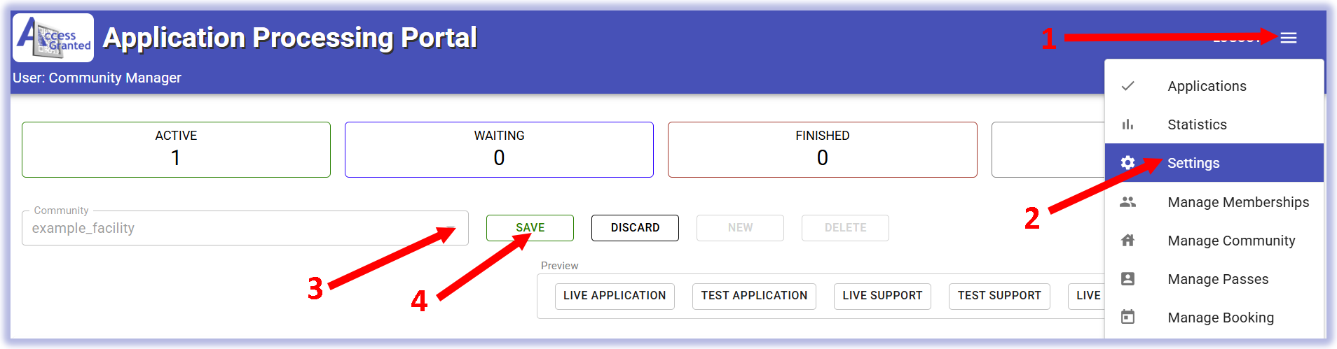 First, go to the Community settings in the Application Portal