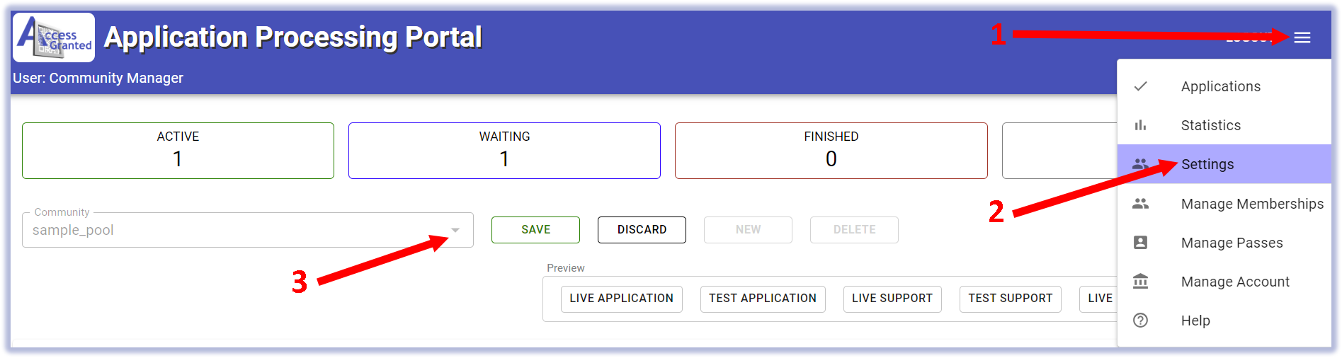 You will find the Community settings in the Application Portal. From the Membership Portal, click the Menu and Manage Applications.