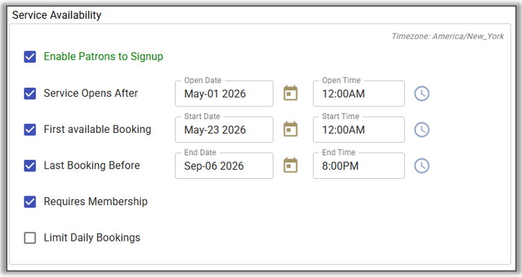 - Service Opens After: May 1st because you do not want your members signing up to early, prior to May 1. (if members can signup anytime, uncheck this)